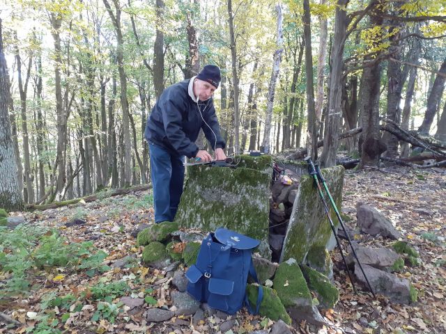 | Fölérve a csúcsra, egy kisebb tisztás volt, a közepén a - kissé omladozó - csúcskővel. Ez pont ideális volt a településre. A terjedés jó volt, - megtámogatva a SPOT-okkal, a hétfői nap ellenére is - a chaserek jól jöttek. Közel két órát rádióztam a szokásos három sávon. Ezalatt összesen 84 QSO-t naplóztam, benn 5 HA állomás és egy POTA. | ![]() | |