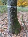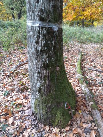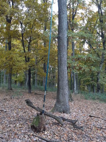 ![]() | Aktiválásom során néhány helyen találkoztam ilyen cellux-szalaggal a fa törzsére körbetekerve. Először azt gondoltam, hogy esetleg egy korábbi aktiváló felejthette ott. (Bár mi ugye semmit nem hagyunk fenn a hegyen!) Most viszont megoldódni látszik a rejtély. Hozzáérve a celluxhoz, a kezebbe akadt egy drót: követve lefelé egy földelő karóra csatlakozott. | |