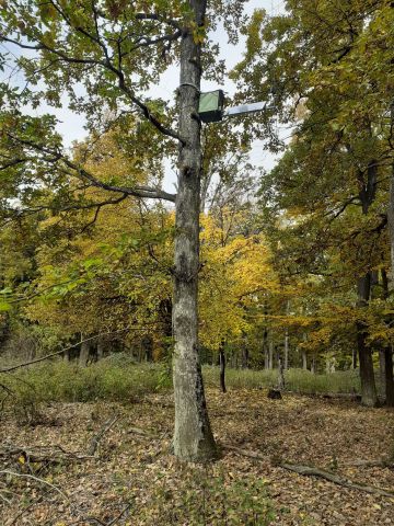 | Fölfelé nézve: egy doboz, egy napelem és egy antenna. Gondolom az erdészek rakhatták fel és egy éjszakai vadmozgást figyelő rendszer egyik eleme lehetett (valószínűleg mozgásérzékelővel is ellátva). | ![]() | |